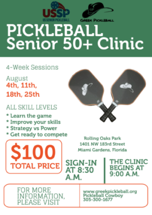 Please join us and register on Pickleheads below. Create an account and you will be all set. Cost is $100 which includes: 4 Clinics August 4th, 11th, 18th and 25th 1 year membership US Senior Pickleball (USSP) $10 discount at Greek Pickleball Events for 1 year (current members of USSP only) REGISTER NOW